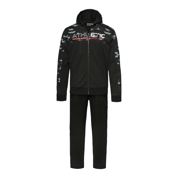 Machen Sie sich’s gemütlich – in diesem bequemen Freizeitanzug! Seine Jacke punktet mit durchgehendem Reißverschluss, sportlichem Print auf Brusthöhe, Kapuze sowie 2 Einschubtaschen. Diese finden sich auch seitlich in der Hose, die Ihnen dank elastischem Gummizug, Innenkordel und offenem Beinabschluss einen hohenTragekomfort bietet.