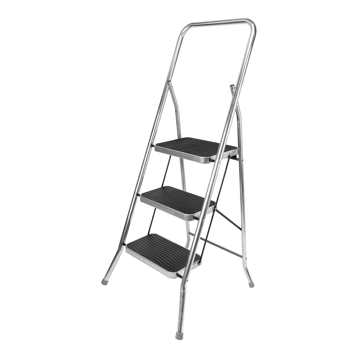 Ob die Blumenvase ganz oben im Küchenschrank oder die defekte Glühbirne in der Deckenleuchte im Flur, im Haushalt gibt es immer wieder Situationen, in denen man selbst auf Zehenspitzen nicht weiterkommt. Doch auf den nächstbesten Stuhl zu steigen, ist riskant und führt nicht selten zu Stürzen. Eine bequeme und vor allem sichere Lösung für Fälle, in denen die eigene Körpergröße nicht ausreicht, ist diese dreistufige Klapp-Trittleiter. Dank ihres leichten und robusten Gestells aus Aluminium lässt sie sich schnell hervorholen. Ausgeklappt findet die Leiter mit ihren Gummifüßen auf Fliesen aller Art über PVC bis hin zu Teppich auf jedem Untergrund sicheren Stand.
