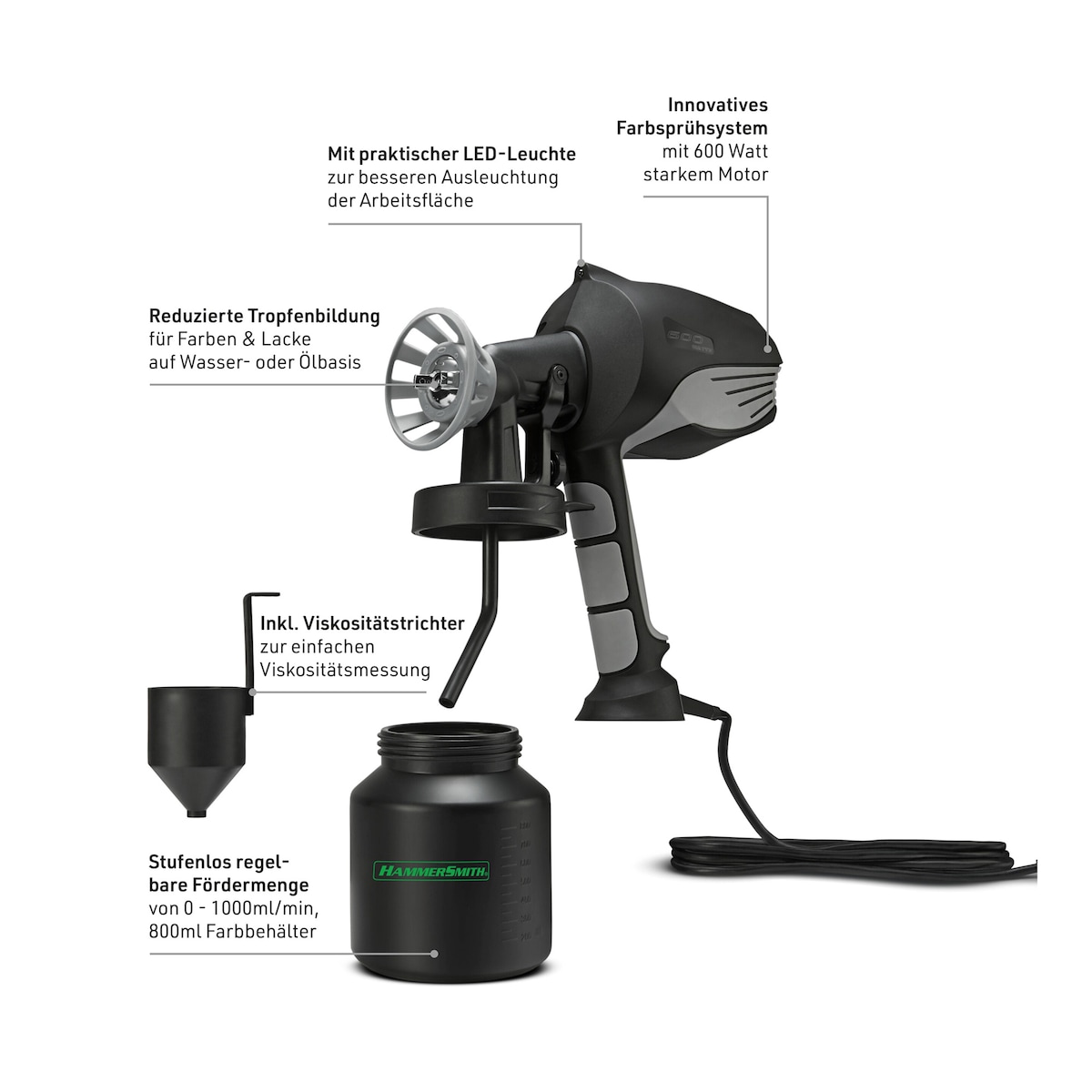 Unser Farbsprühsystem bietet professionelle Ergebnisse mit innovativer Mikro-Spray-Technologie. Sparen Sie Zeit und Kraft bei gleichmäßigem Farbauftrag. Die Multifunktionsdüse ermöglicht Präzision und Anpassung an verschiedene Oberflächen. Ideal für Wände, Möbel, Tore und mehr. Die LED-Leuchte sorgt für optimale Ausleuchtung, selbst in dunklen Ecken. Sparsame Farbverwendung, stufenlose Fördermenge und 600 Watt Motor geben volle Kontrolle. Kompakt, leicht, reduzierte Tropfenbildung – das perfekte Farbsprühsystem für jedes Projekt.
